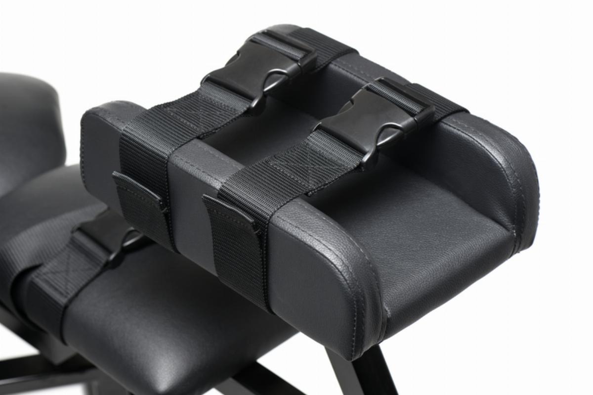 Verwende die beiden D-Ringe oben auf der Rückenlehne, um die Handgelenkmanschetten um die Hände deines Partners zu sichern oder benutze sie, um Spielzeuge mit einem Clip oder Karabiner aufzuhängen.