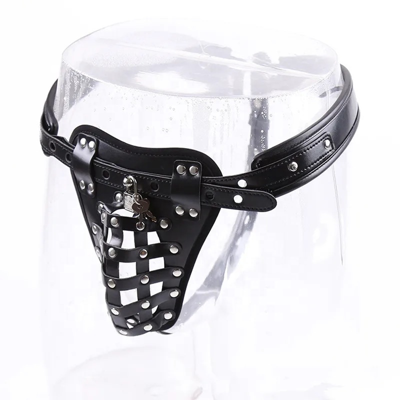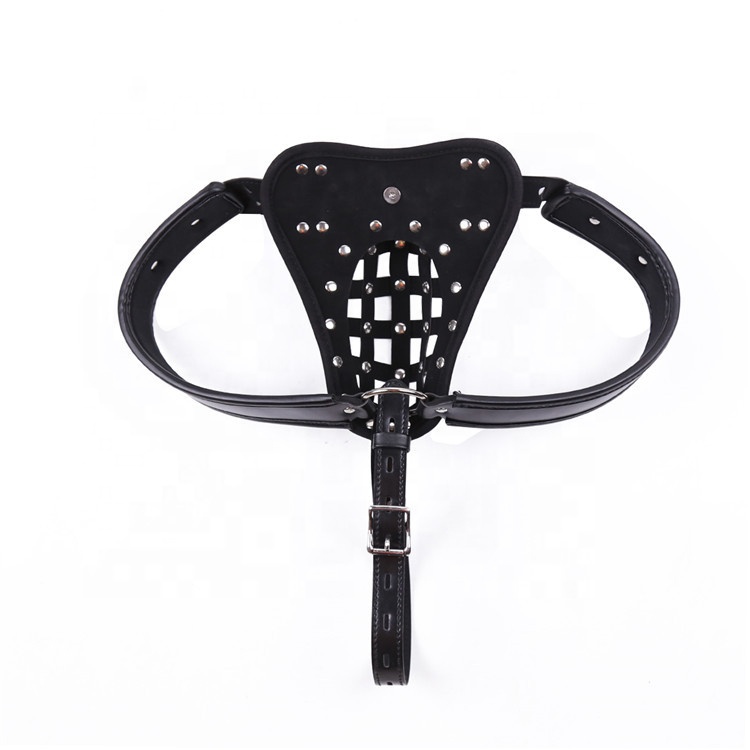 Dieses Chastity-Harness setzt auf eine stabile Frontplatte mit perforierter Cage-Struktur und betontem Kontrollmoment: Ein zentrales Vorhängeschloss fixiert die Front, während der Bund stufenlos anpassbar bleibt. Die Metallnieten und Ringe verleihen dem Accessoire einen authentischen, dominanten Look – ideal für BDSM-Sessions, Rollenspiel und Foto-Sets.
