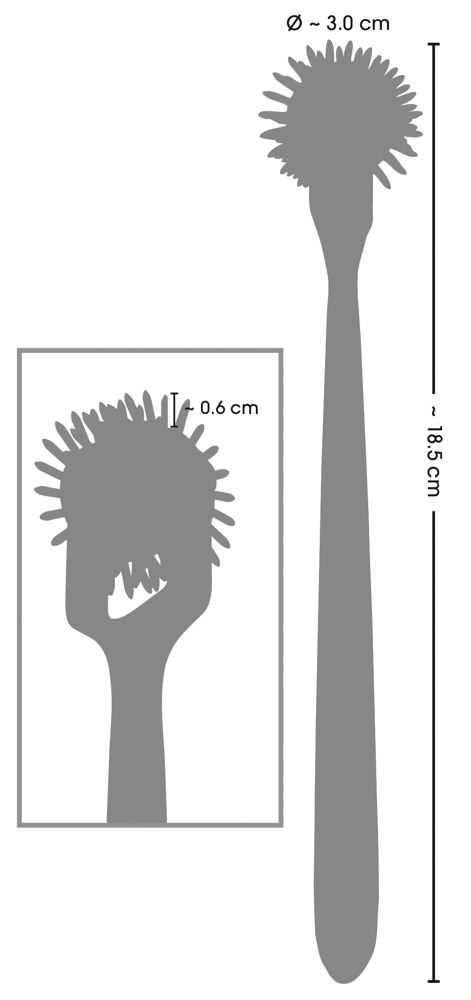 Gesamtlänge 18,5 cm, Rädchen-Ø 3 cm, Nadelspitzen 6 mm lang.